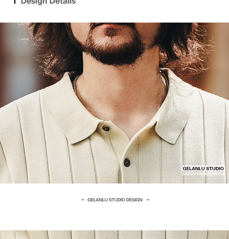 This Pallaband™ high-end button-down polo shirt features a refined vertical stripe pattern that visually elongates the torso and creates a sleek, modern look. The contrast collar and button placket add a touch of smart tailoring, making it easy to dress up or down. Short sleeves and a clean, structured silhouette give it a contemporary, trendy feel suitable for both casual and semi-formal settings.
